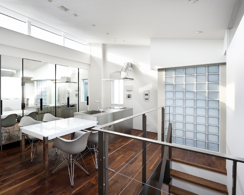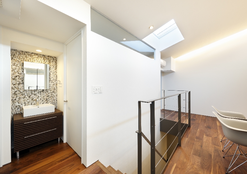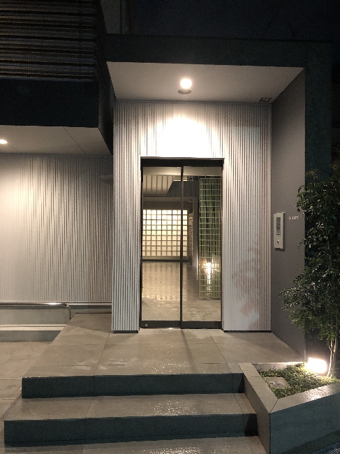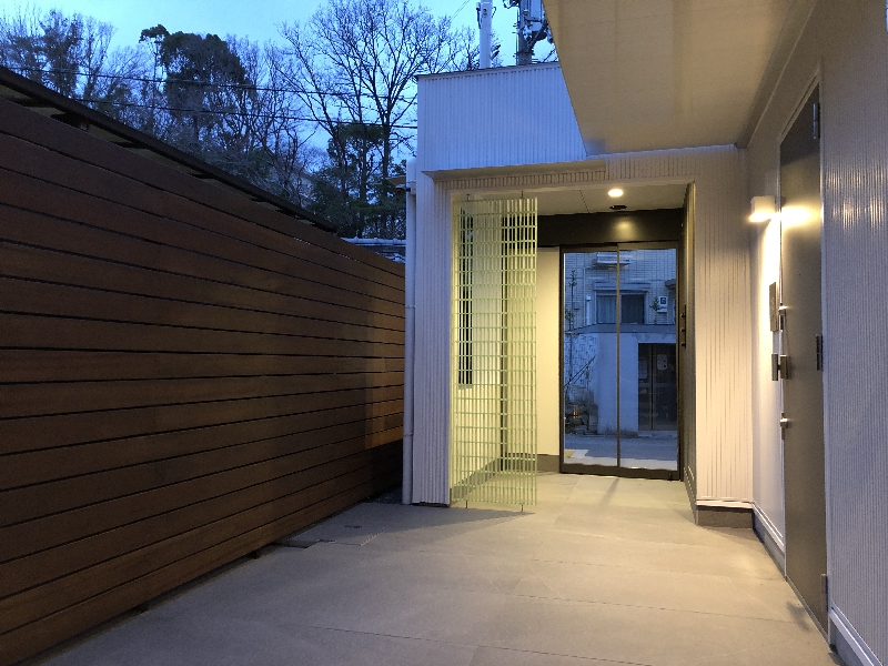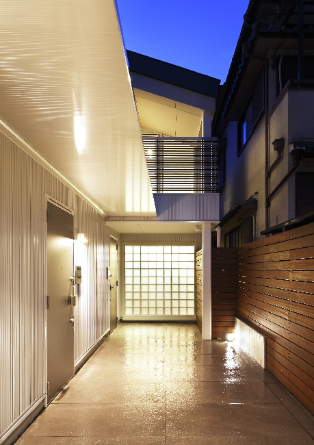 賃貸併用住宅 大阪大学の敷地に隣接した、閑静な住宅街にある、賃貸併用住宅です。 中庭を通り各住戸に入ります。 集合住宅でありながら、戸建ての雰囲気を大切に設計した建物です。 各住戸はメゾネット仕様になっており、賃貸部はロフトを設け開放感 ある部屋としました。