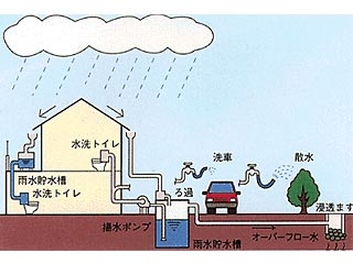 ここで言う雨水利用とは屋根などで集めた雨水を雨水タンクにため、トイレの水、庭の散水、洗車